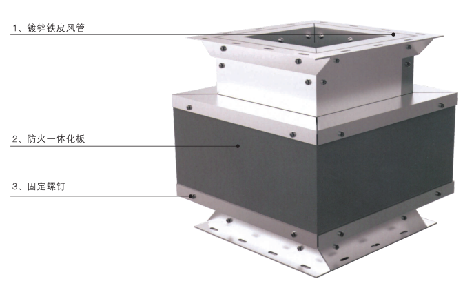 铁皮风管防火一体化板包覆是在《非金属风管制作与安装》国家标准设计图集15K114中的镀锌钢板风管防火包覆组装工艺上进行创造性发明,具有更简便、更快捷、更轻质、更安全等特点。