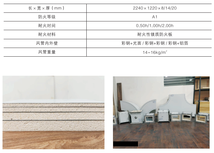 钢面镁质防排烟复合风管使用的耐火隔热层,兼具了防火性、耐火性和隔热性三大属性,是一种全新的耐火隔热材料,在建筑防排烟区管能同事满足GB/T17428-2009耐火完整性和隔热性。